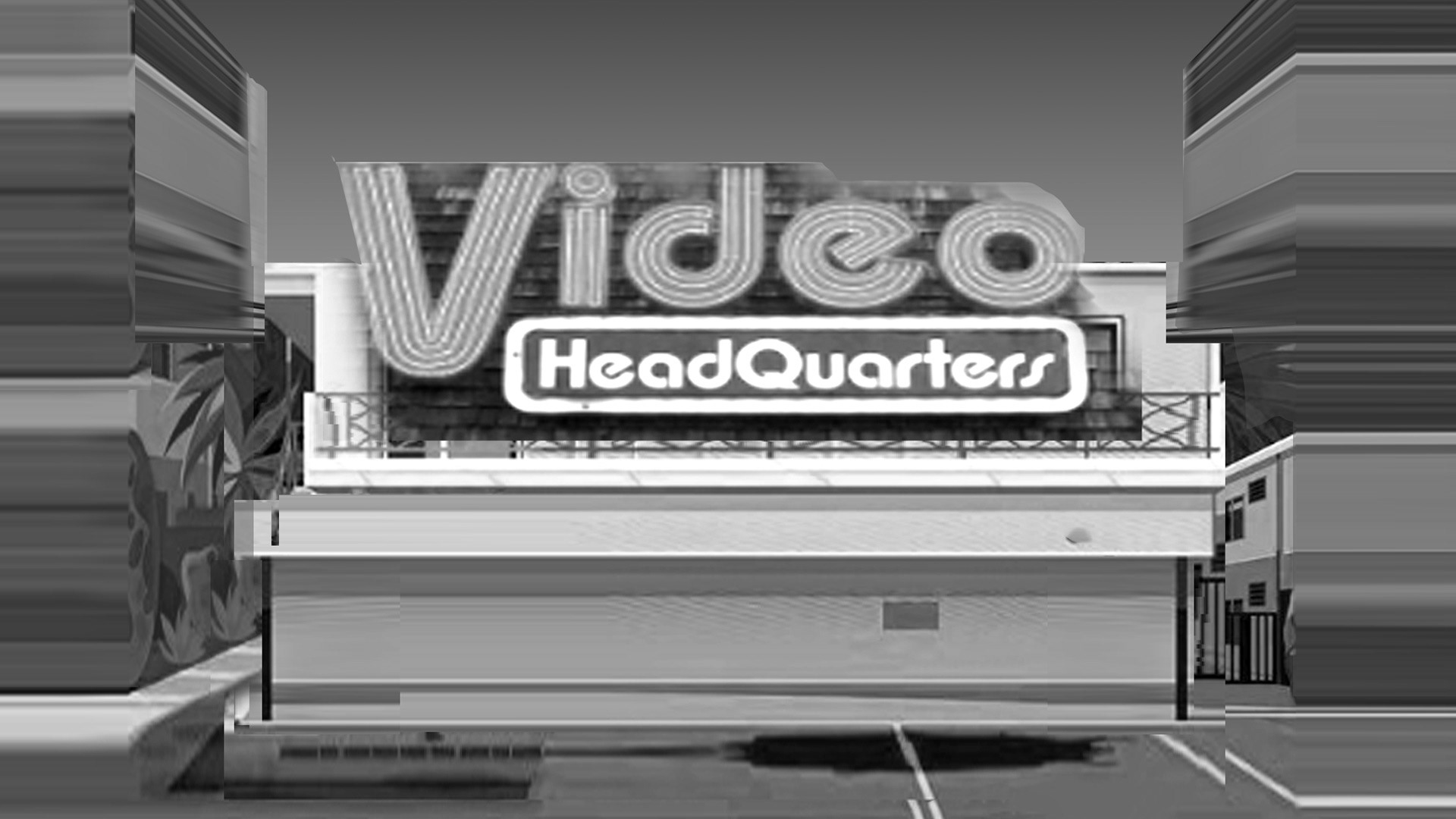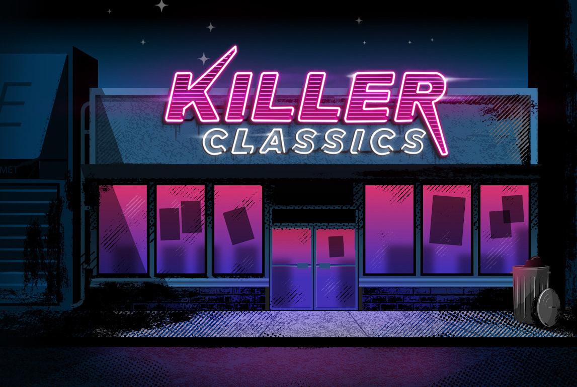 The exterior look of the video store went through a lot of stages of ideation, starting with a quick photobash for composition, and then iterating work on lighting and mood until we nailed down the final look. Cryssy and I would pass the illustration back and forth, each working on top of it with our ideas about value, lighting, fonts, and style, until we ended up with the final shopfront.