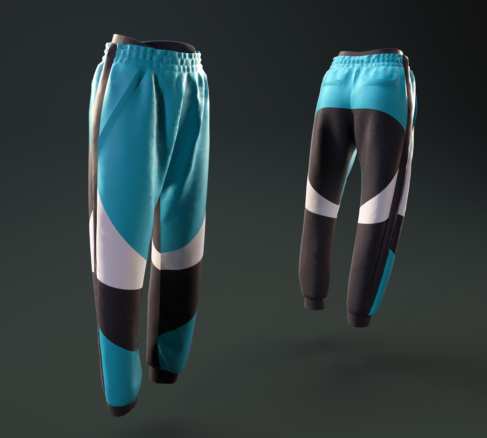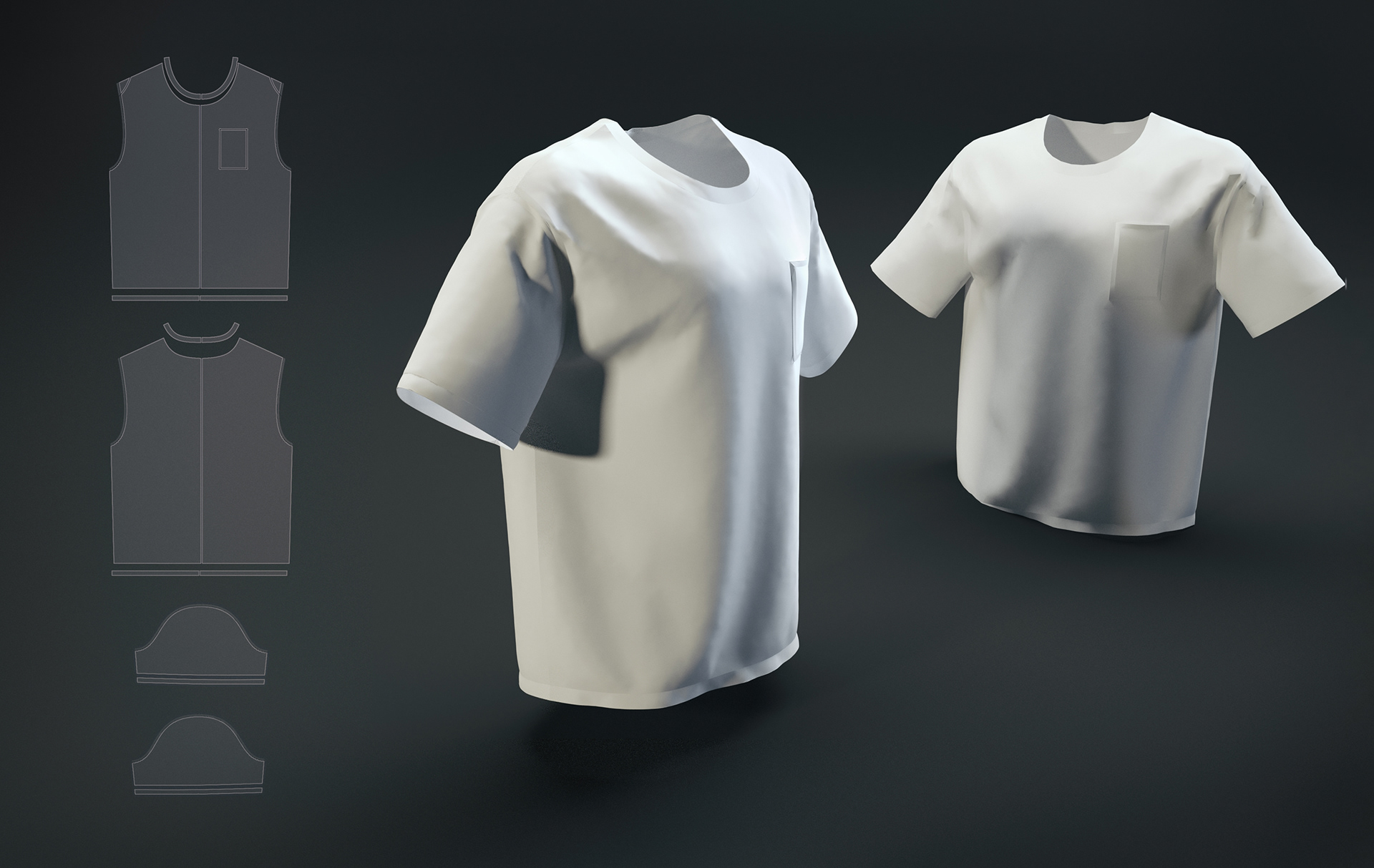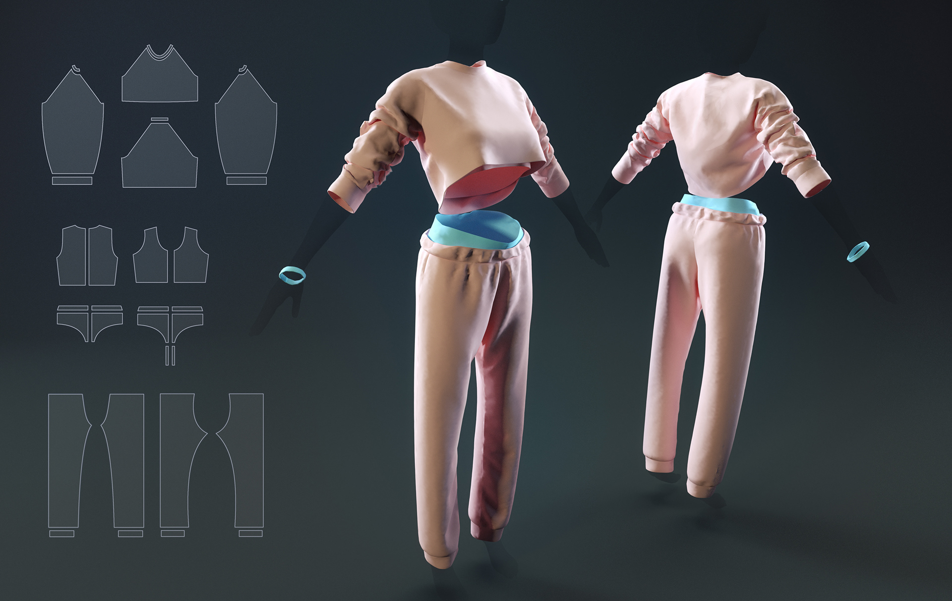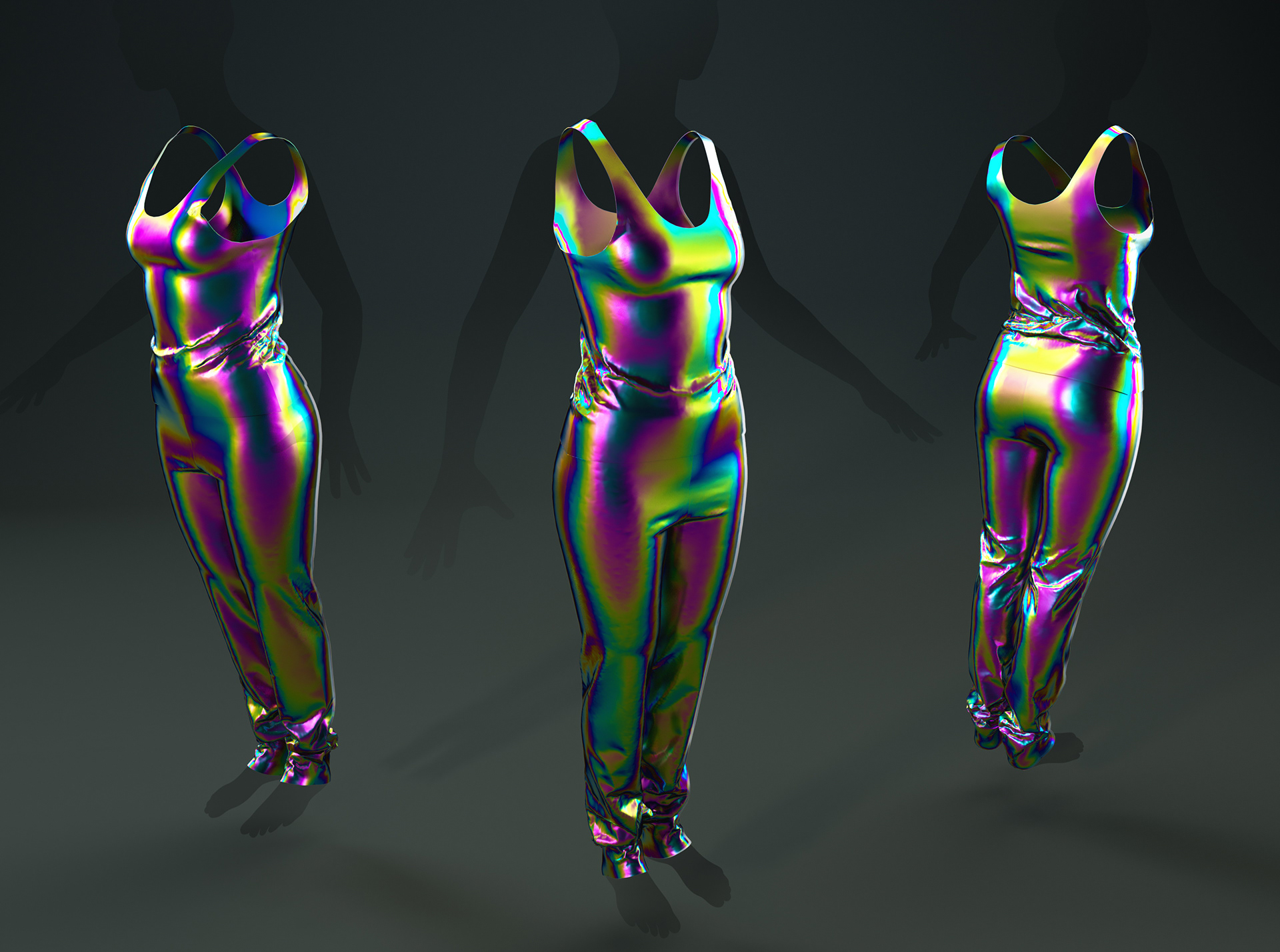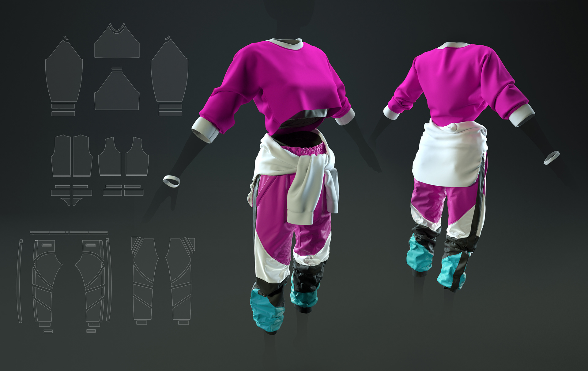 Experiments with Marvelous Designer, including multiple fabrics and a sweater tied around the waist.