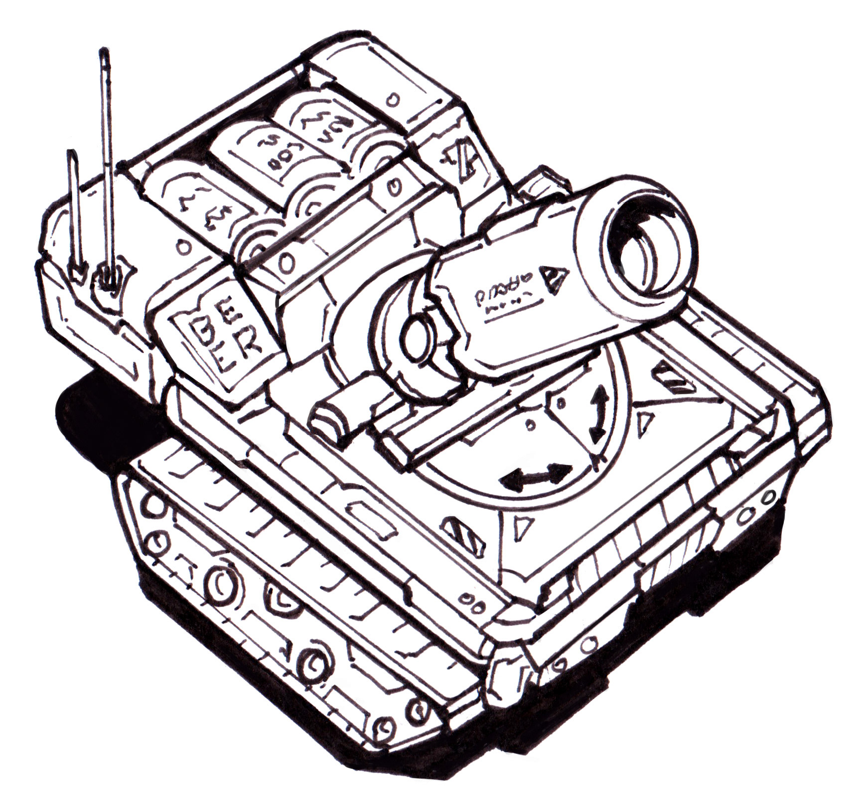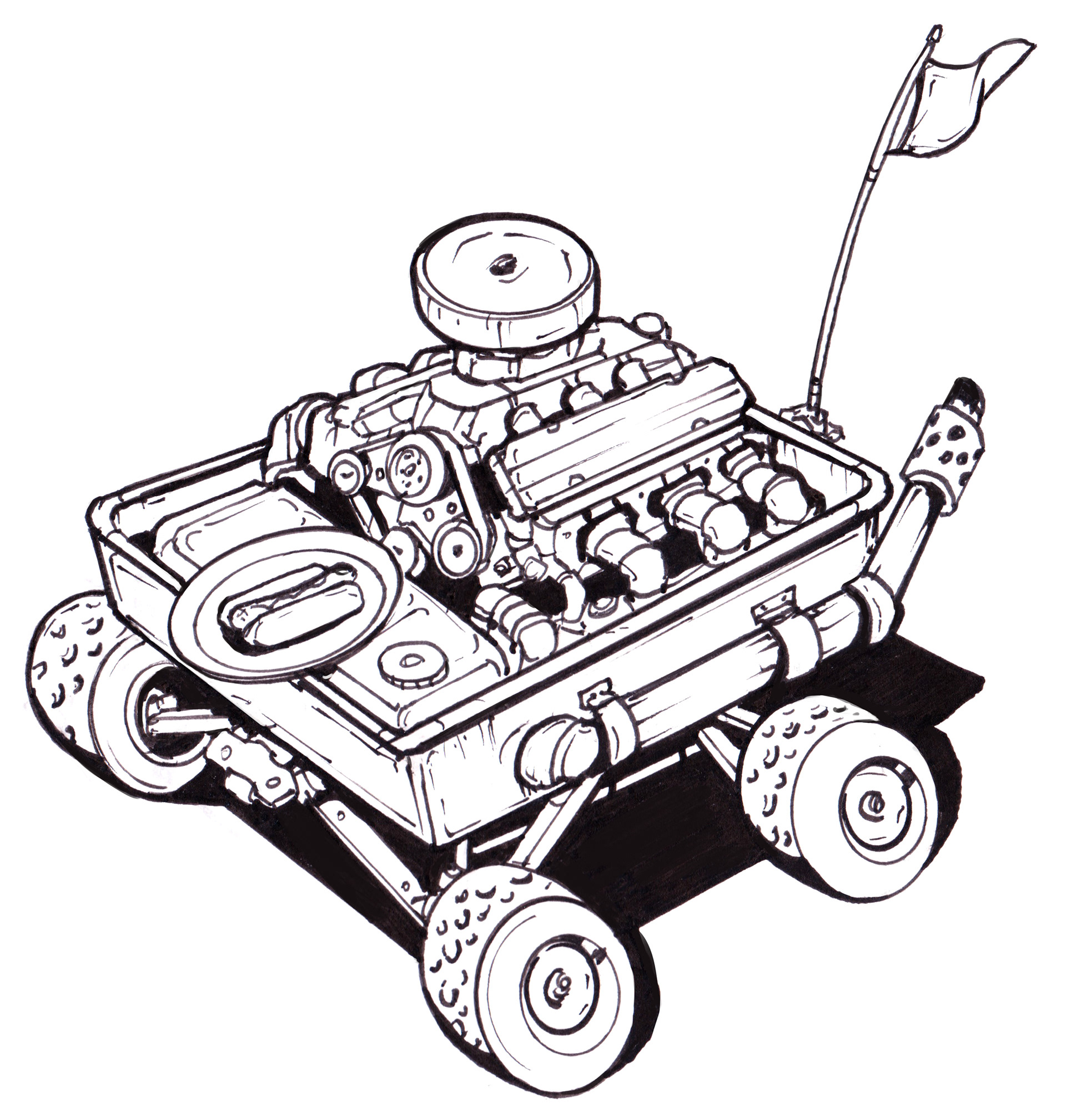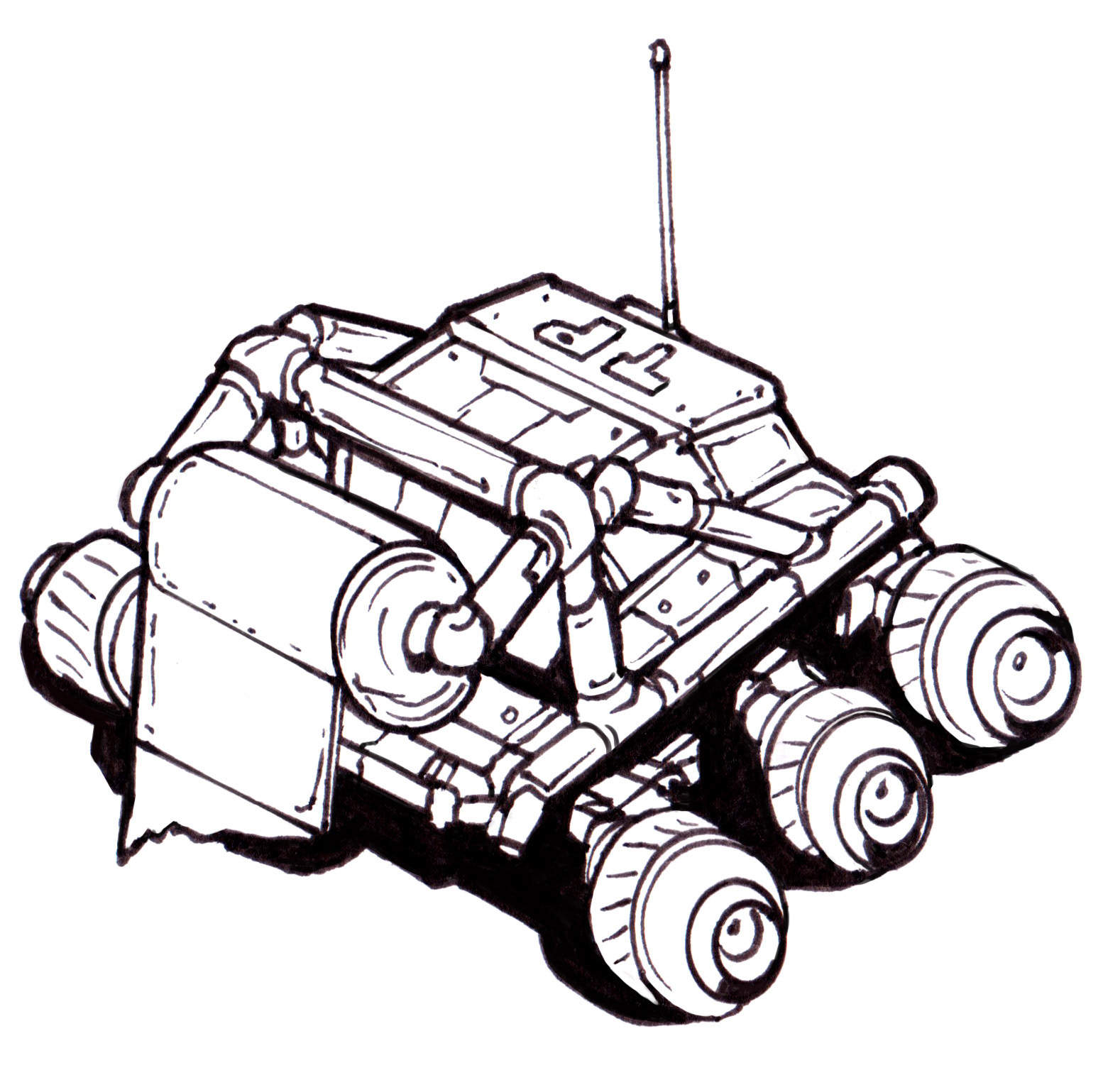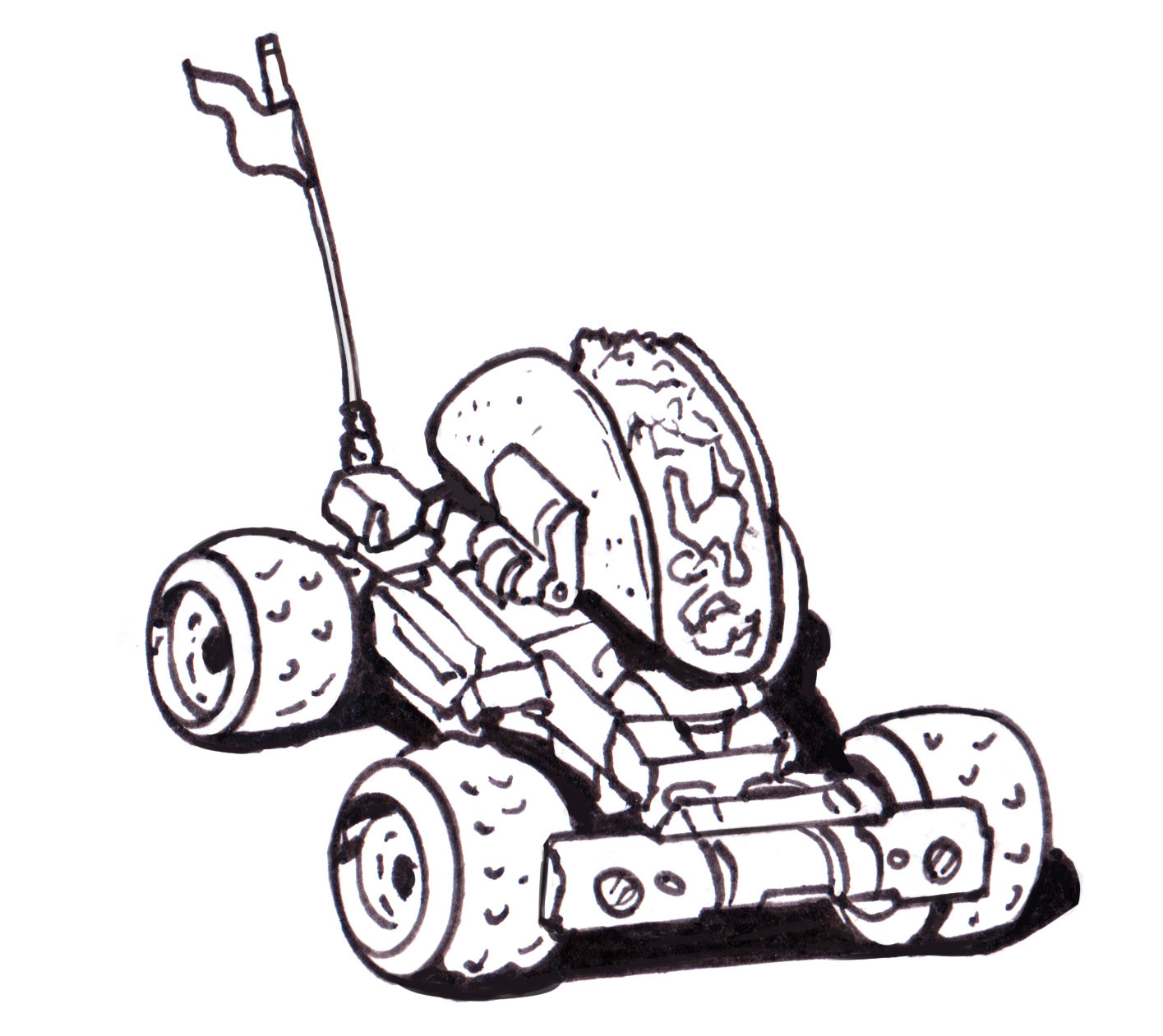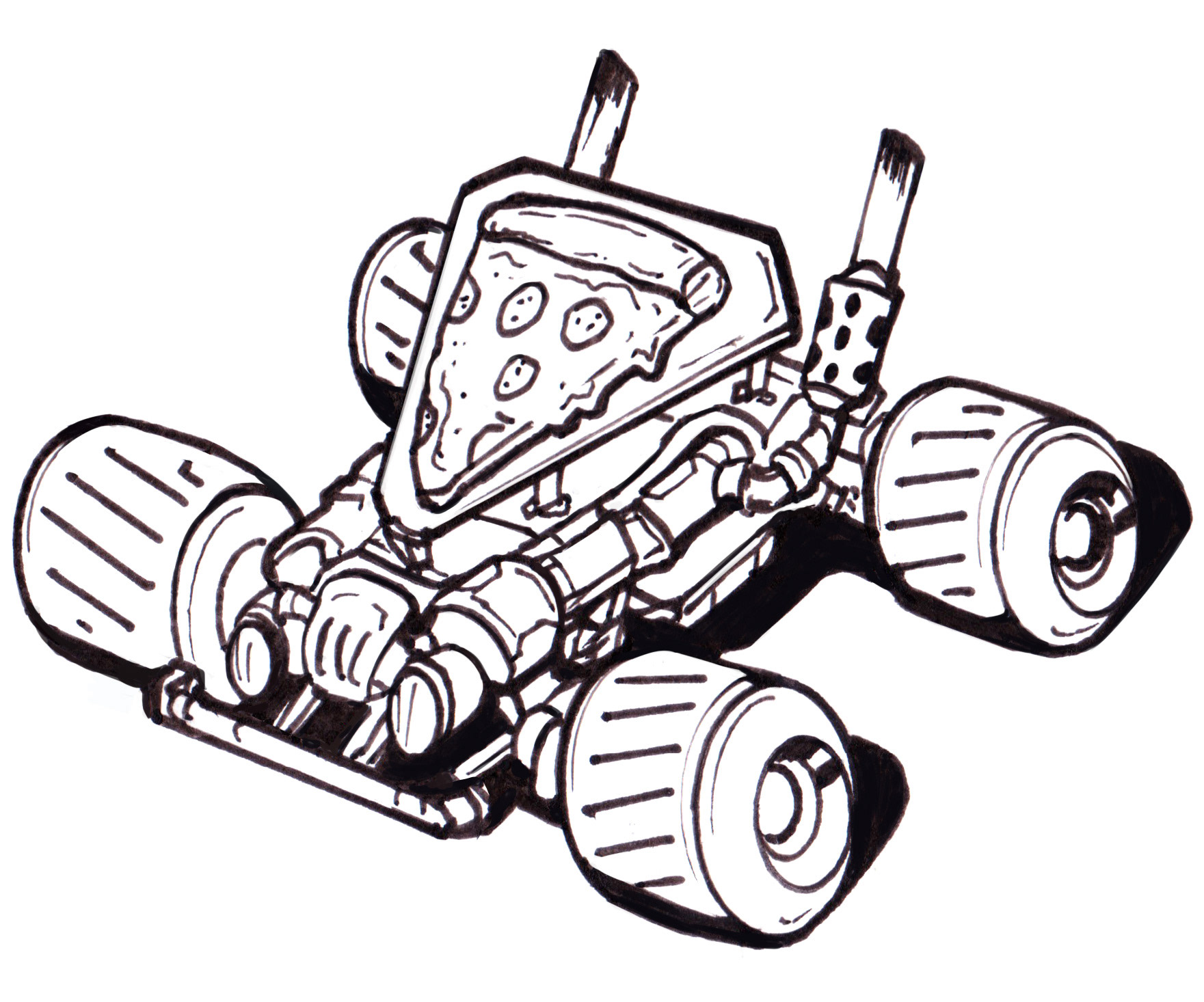 Need food or other necessities delivered in record time? Call up this gang of remote-controlled vehicles! Drawn in pen at Burning Man 2024.