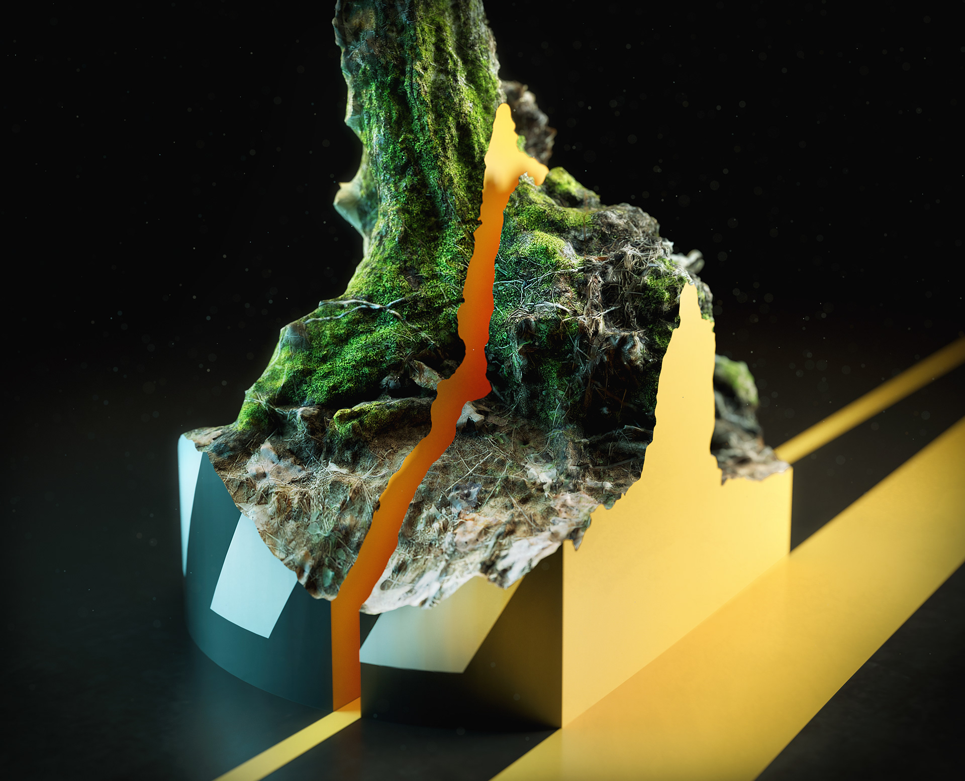 I love to capture photogrammetry and rendered some of my solves as museum displays of sections cut directly out of nature in geometric blocks, and then sawn through by rays of color. It would be super fun to fabricate these in real life as part of a gallery show.