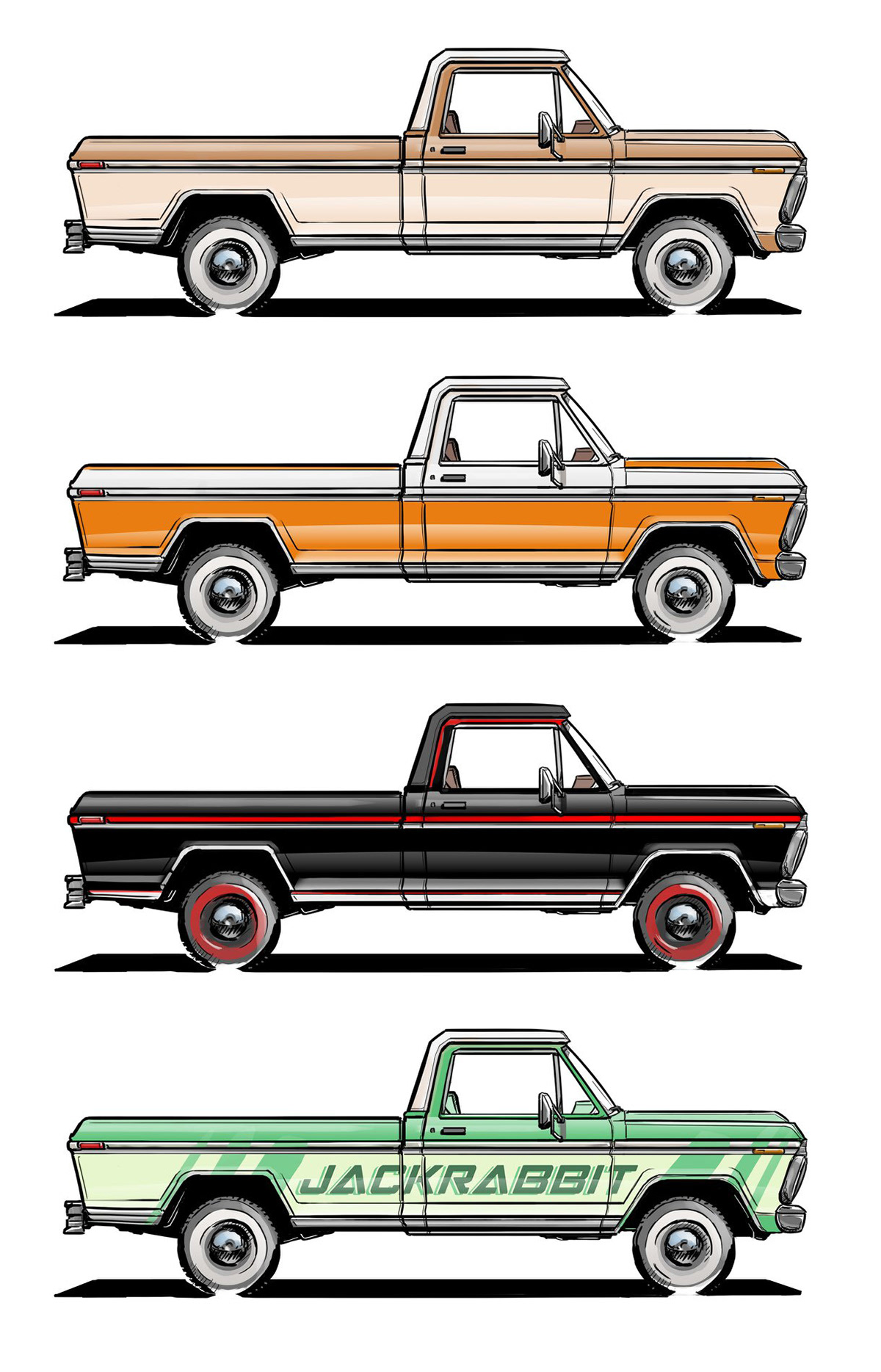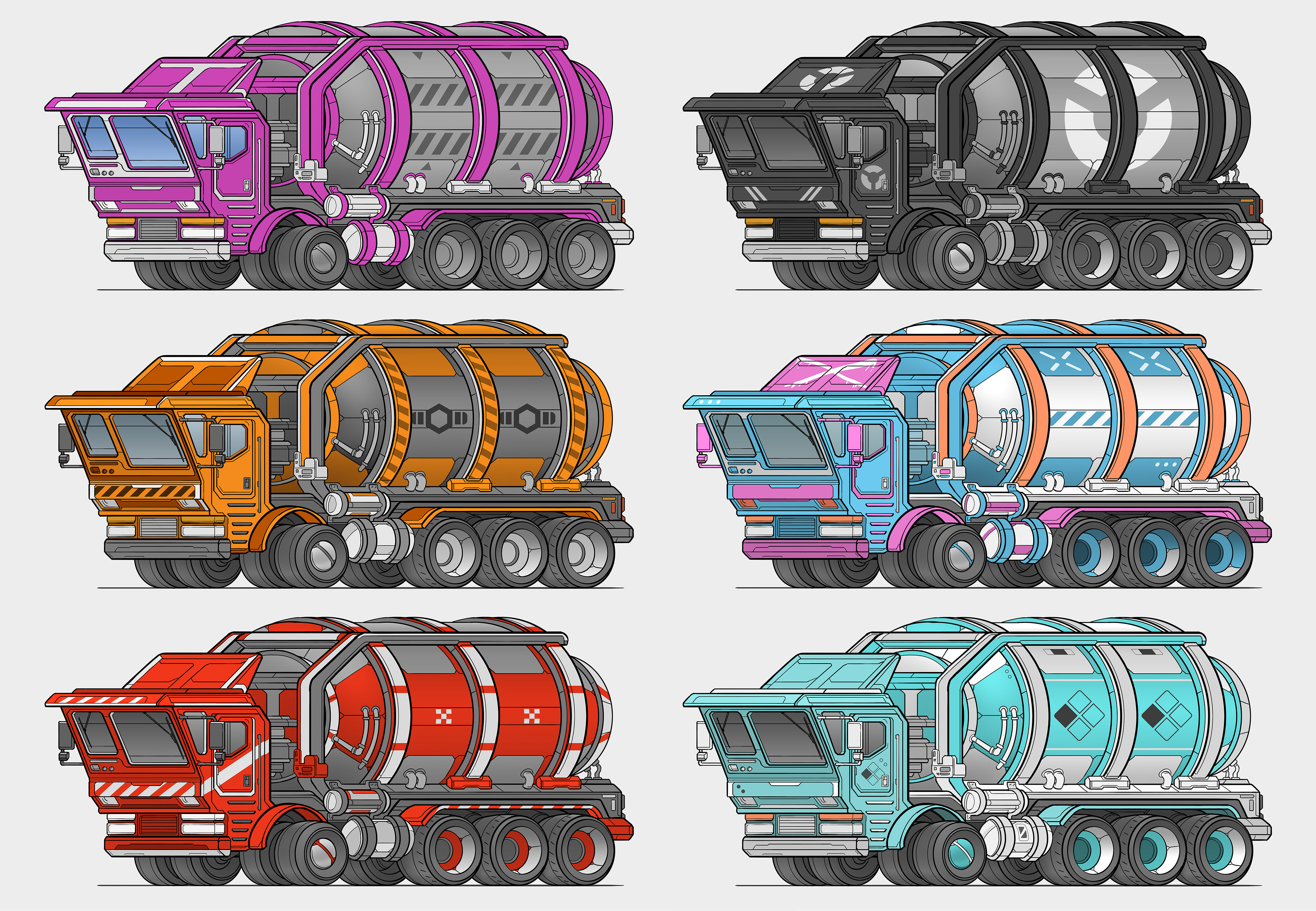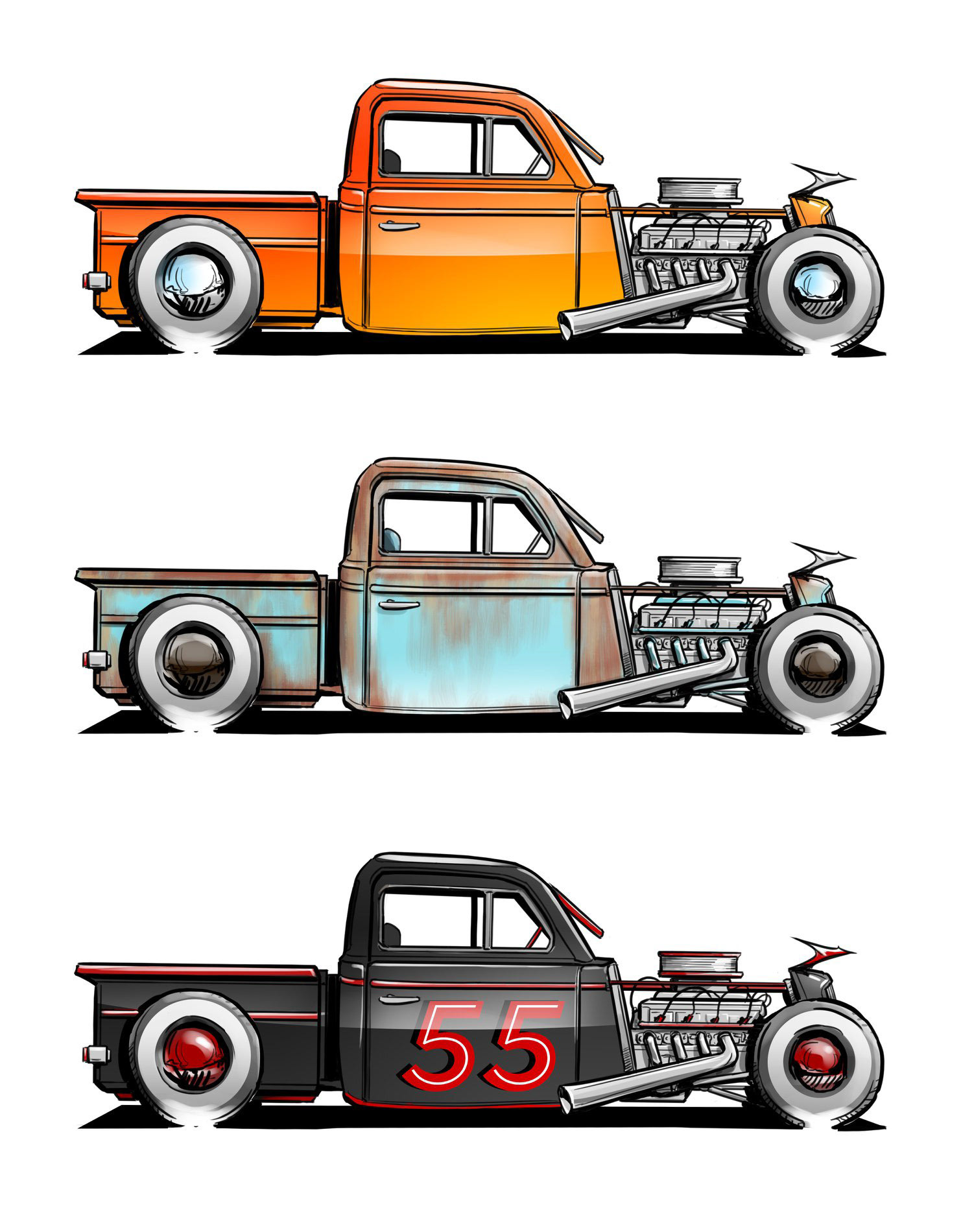 Trucks and cars, classic and industrial, drawn by hand in Photoshop.