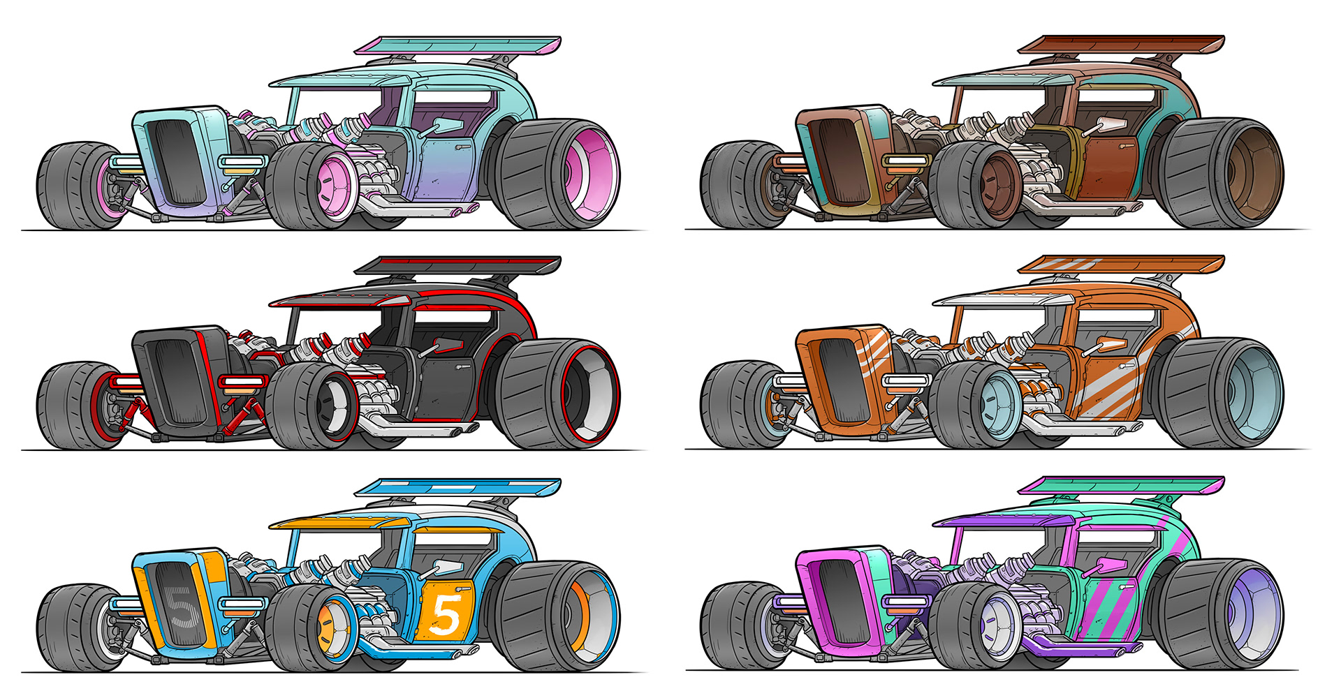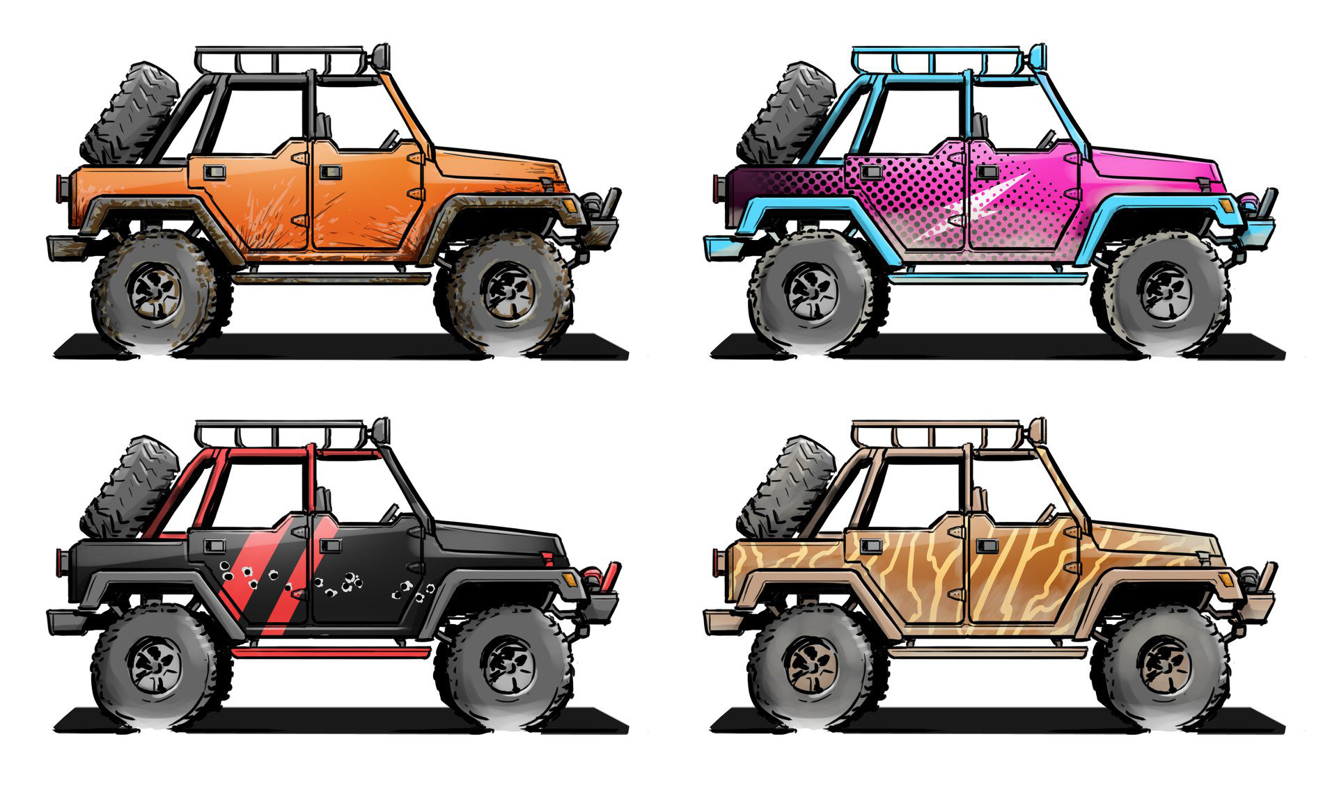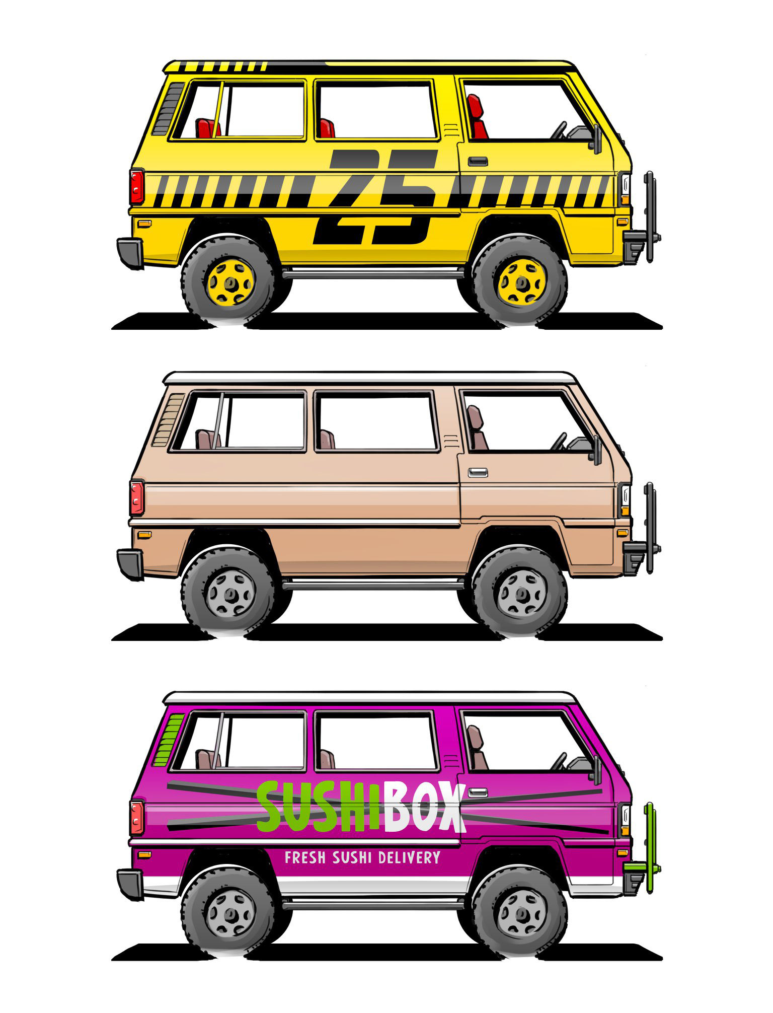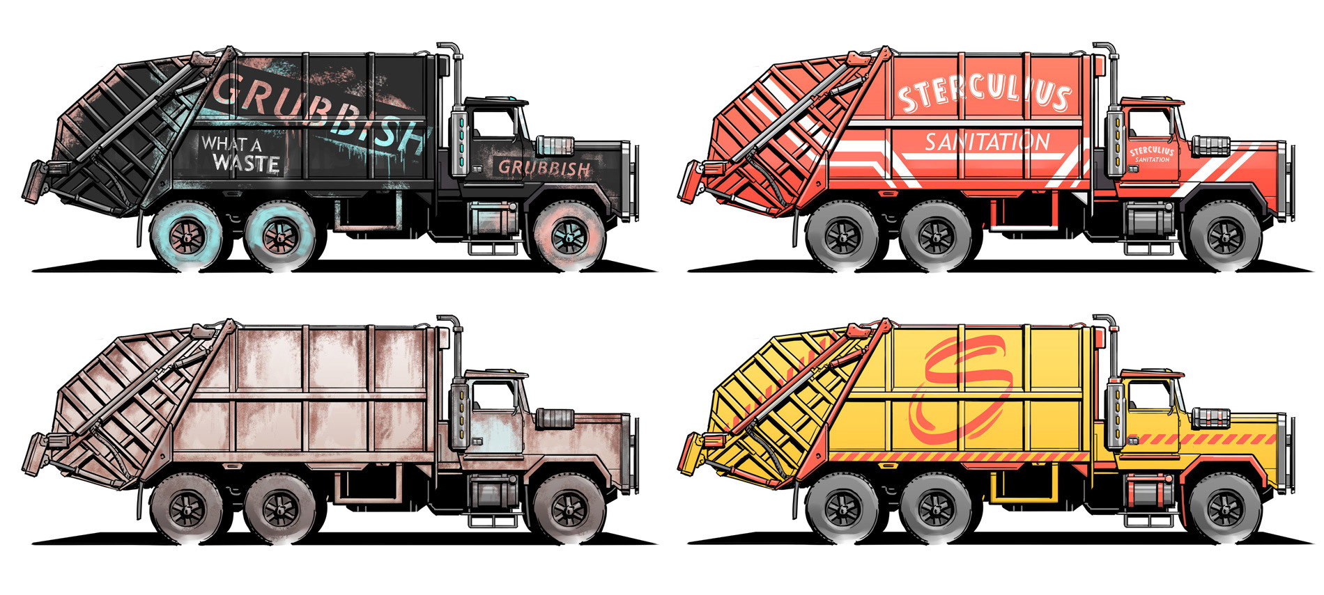 Trucks and cars, classic and industrial, drawn by hand in Photoshop.